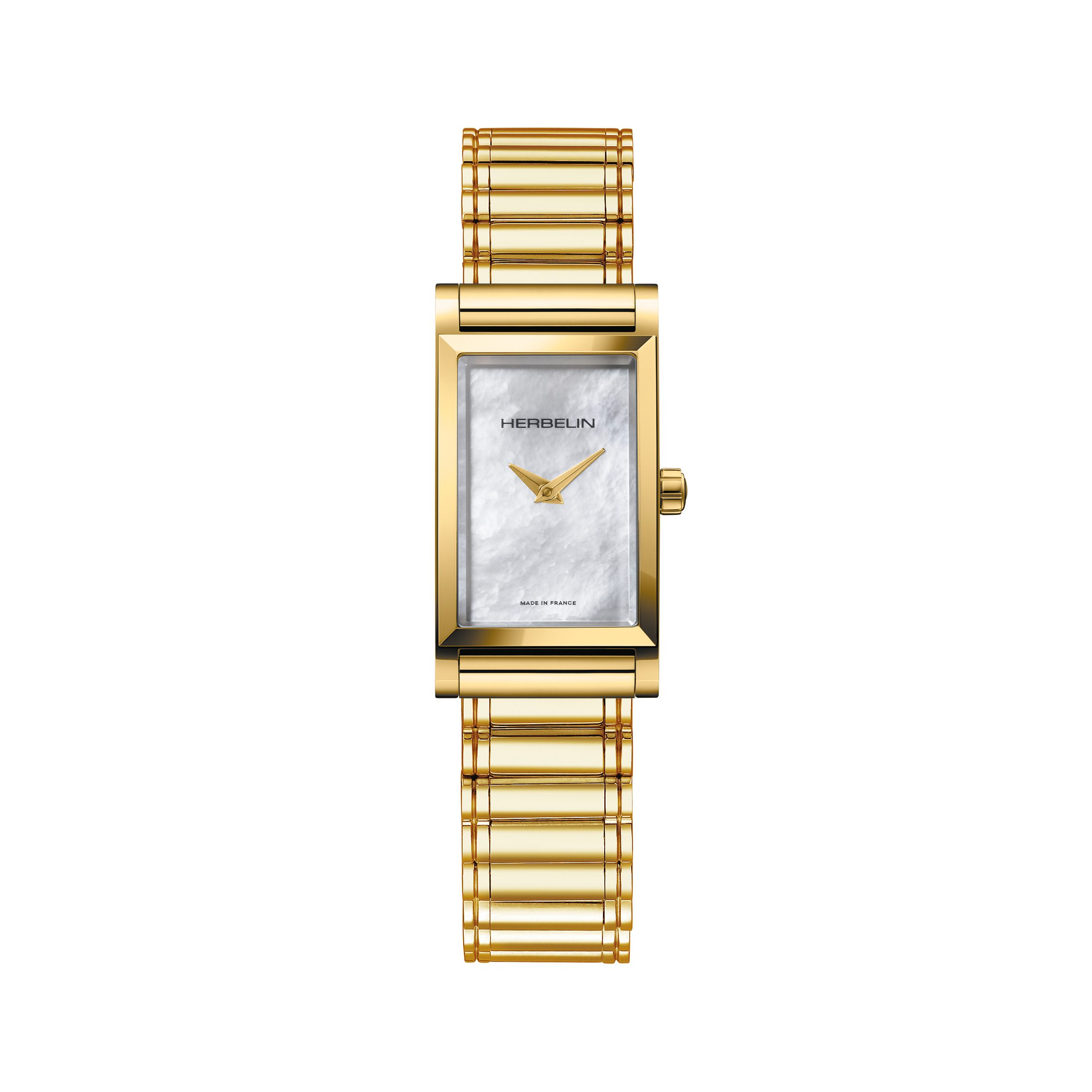 Cilalı bir yüzeyle oyulmuş dikdörtgen kasa (19x27mm), yeni HERBELIN logosuyla imzalanmış kadranın dış hatlarını güçlendiren eğimli bir çerçeve ortaya koyuyor. Stilize ibreleri ve indeks olmamasıyla minimalist, doğal beyaz sedef zemininden ışıltılı yansımalarla parlıyor. Eşit yönlü bir safir kristal ile korunan set, tam bir şıklık içinde zamanı gösteriyor.