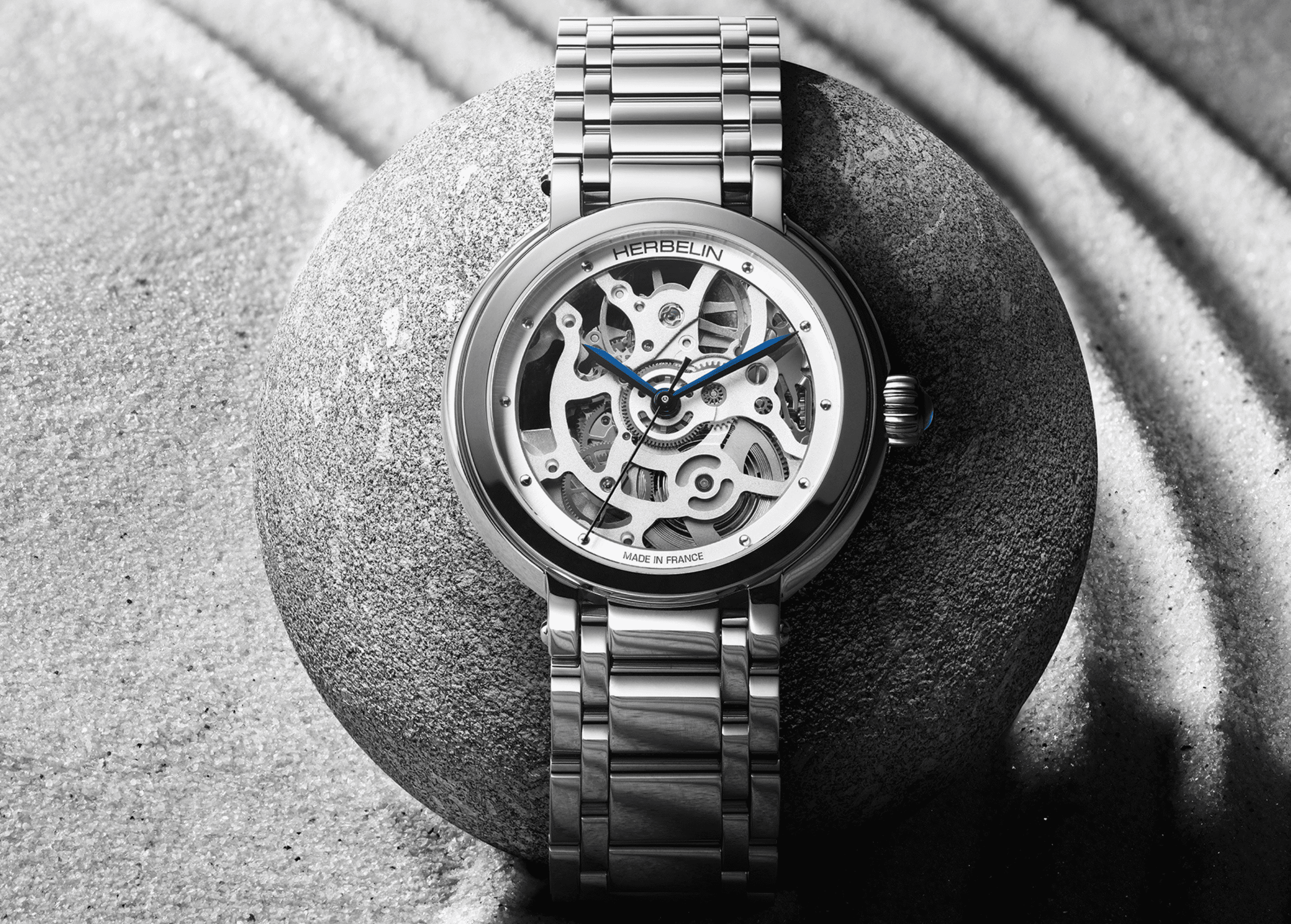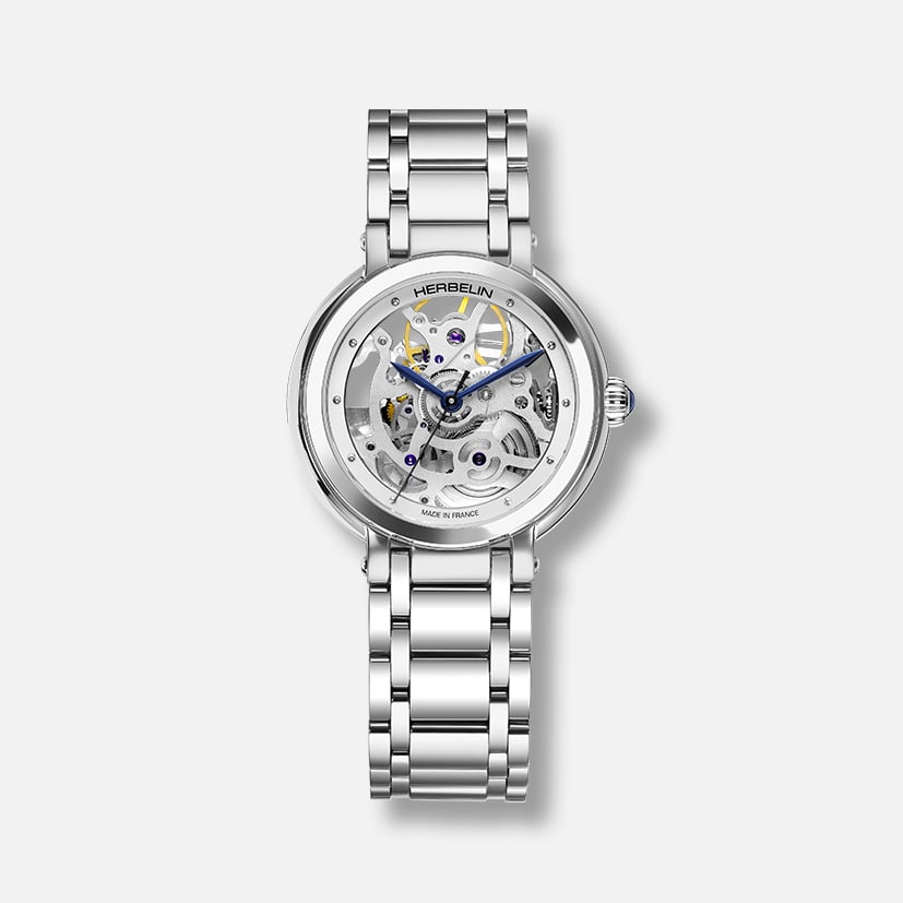 Parlatılmış çeliğiyle yansıyan ışığı yakalayan çerçeve, dikkatleri kadrana çekerek, otomatik kurmalı mekanizmanın modern kuşbakışı görünümünü sunuyor. Daha az içerik, daha fazla stil: bir anlamı ortaya çıkarır. Bileşenlerin ve dişlilerin bir dizi kaligrafik yukarı ve aşağı vuruşla tek parça halinde hareket ettiği mekanik bale. Galet için özel olarak yaratılan bu iskelet, sade rodyum kaplamayla HERBELIN’in saat yapımı uzmanlığını ifade ederken aynı zamanda zamanın orkestrasyonunun karmaşık mimarisini de sergiliyor.